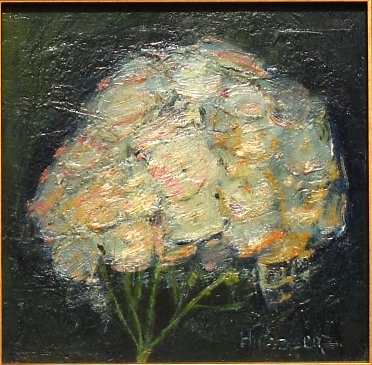 Hortensia’s, liefdevol gekoesterd in een wit roze wolk, fonkelend door zacht geel. Innig aan elkaar verknochte bloemen. In dit hemellichaam spelen ze samen een engelachtig spel. Onmiskenbaar bedoeld om tegelijkertijd de diepere, liefdevolle grond van paradijselijke schoonheid te verhullen, en al vast te onthullen.