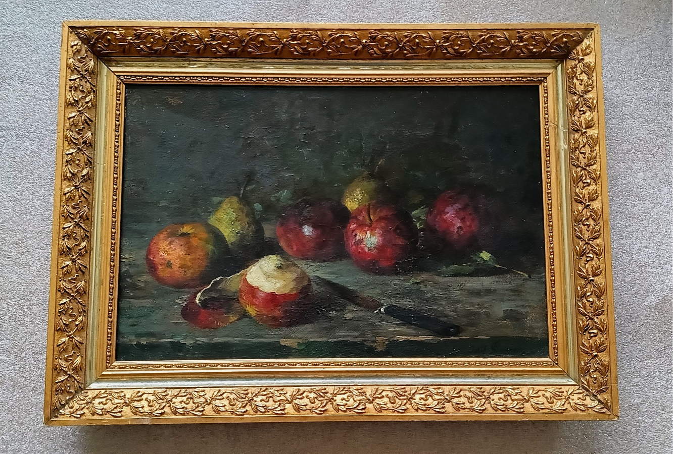 Appels en peren. Gindra herschept ze in dit stilleven. Daarin liggen ze niet meer voor het grijpen, hangend aan de boom, of liggend in de schappen van de supermarkt. In dit kunstwerk is fruit onaantastbaar. Hier mag niets snel worden betast, gegrepen, doorgeslikt en verteert. Fruit, zweeft in dit schilderij in het dubbel duister van haar nachtelijke natuur. Dat is fruit, met alles wat bij vruchten hoort: vlekken, schimmels, vuil, gaten, rotte plekken, … En ja, appels en peren, plots volledig met elkaar te vergelijken.