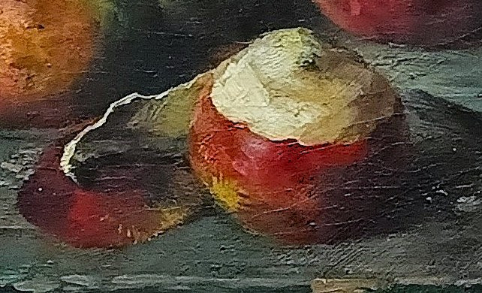 Wat groot is, moet dat worden. Het kaarsrechte mes ligt plat en klaar op de tafel. Onverbiddelijk als het is, haaks tegen de horizontale richting van het fruit in. Naast het mes een appel, geroepen uit de rij wachtenden. Nee, het scherp en diep snijdend mes is geen moordenaar. In de schatkamer van het schilderij is het de genadige verlosser van alle vruchten, hoe gekwetst en beschimmeld ook. Dan is voor het fruit de tijd rijp voor de ontknoping van dit wonderlijke stilleven. Een brandschone appel, gezuiverd van alle vlekken en versierd met een fraaie slinger, viert feest op het offerblad van de tafel.